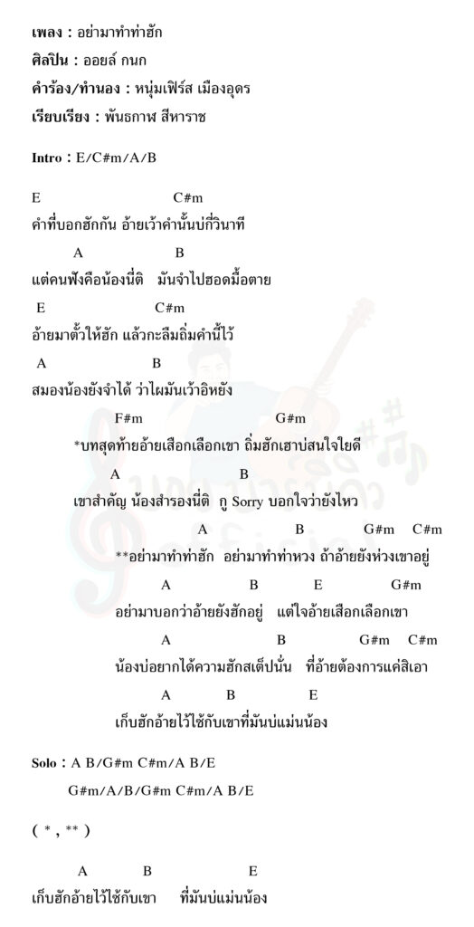 คอร์ดเพลง : อย่ามาทำท่าฮัก ศิลปิน : ออยล์ กนก คำร้อง/ทำนอง : หนุ่มเฟิร์ส เมืองอุดร เรียบเรียง : พันธกาฬ สีหาราช